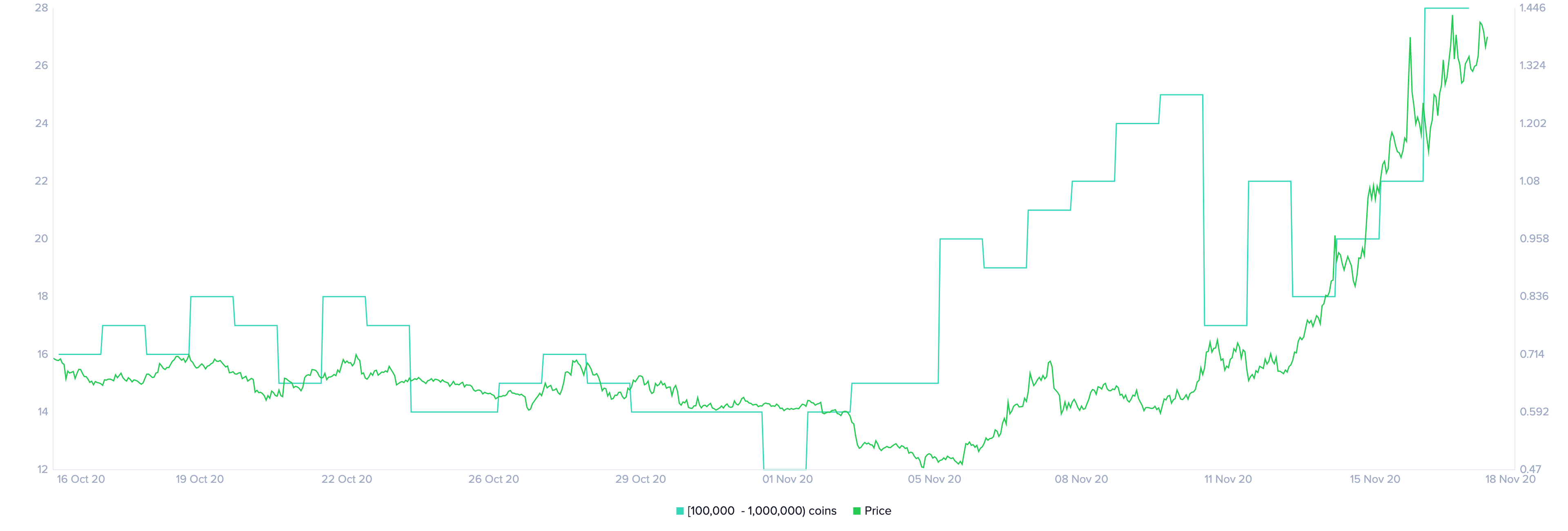 SUSHI whales continue accumulating tokens. Since the beginning of the month, the number of addresses holding from 100,000 to 1,000,000 SUSHIs more than doubled, signalling that large network supporters bet on the further price increase. A significant spike in the number of whales addresses may translate into considerable buying pressure.