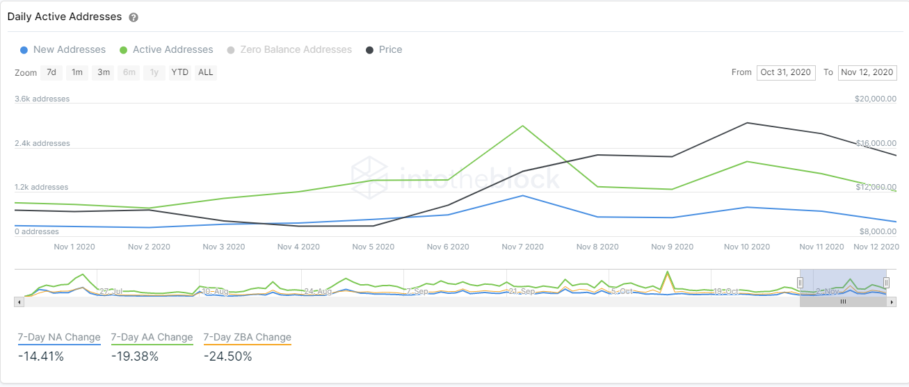 YFI/USD daily chartDespite the spike in the number of new addresses joining the network on November 7, it seems that the trend is a downtrend now. In the past week, this number dropped by 14%. Similarly, the number of active addresses also dropped by 19%, indicating that investors are losing interest in YFI, despite its price growth.